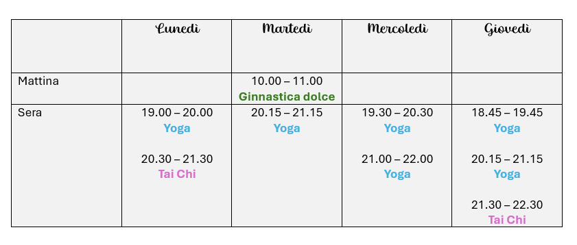 Scopri il nostro programma settimanale di lezioni di yoga e tai chi, aperto a tutti i livelli.